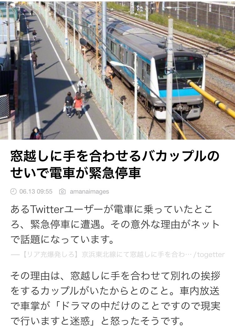 𝕙𝕞 On Twitter 悲報 京浜東北線 窓越しに手を合わせて別れの挨拶をするバカップル のせいで緊急停車 車掌に車内放送で ドラマの中だけのことですので現実で行いますと迷惑 と怒られる
